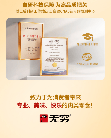 儿童零食不只要求平安,其养分价值也日益遭到关心。无限食物正在2015年便成立了“国度级博士后科研工做坐”,这标记着其研发勾当进入了更高条理。同时,做为“国度食物平安尺度制定”的主要参取者,无限食物凭仗本身外行业内的深挚积淀取专业实力,不只为鞭策整个肉类零食行业的规范化、尺度化成长贡献了主要力量,更以本身严酷遵照高尺度出产的现实步履,进一步夯实了其正在消费者心中的靠得住抽象,稳稳连结预包拆鸡肉类零食全国行业领先的劣势。