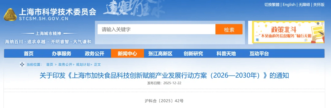 12月22日,上海市科学手艺委员会发布《加速食物科技立异赋能财产成长步履方案(2026—2030年)》。
